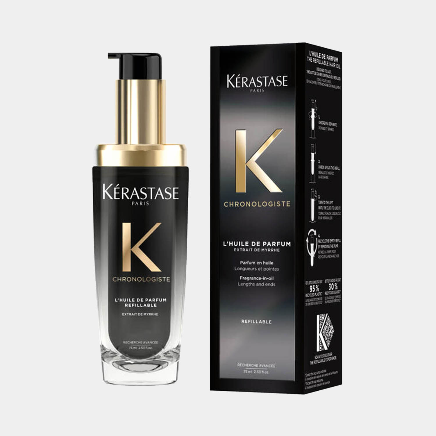Añade un brillo increíble y una fragancia única a tu cabello. Huile de Parfum es la nueva presentación del emblemático aceite de tratamiento perfumado de Kérastase. Este aceite tratante, creado a partir de una fragancia personal y exclusiva del reconocido perfumista Alberto Morilla, da el toque final perfecto a cualquier tipo de cabello y peinado, proporcionando brillo intenso. El acabado es un cabello sedoso, lustroso e hidratado. ¡Déjate seducir por este aroma característico de la gama, con rosa de té, peonía, magnolia y notas cítricas, y haz que tu look luzca perfecto en toda ocasión!